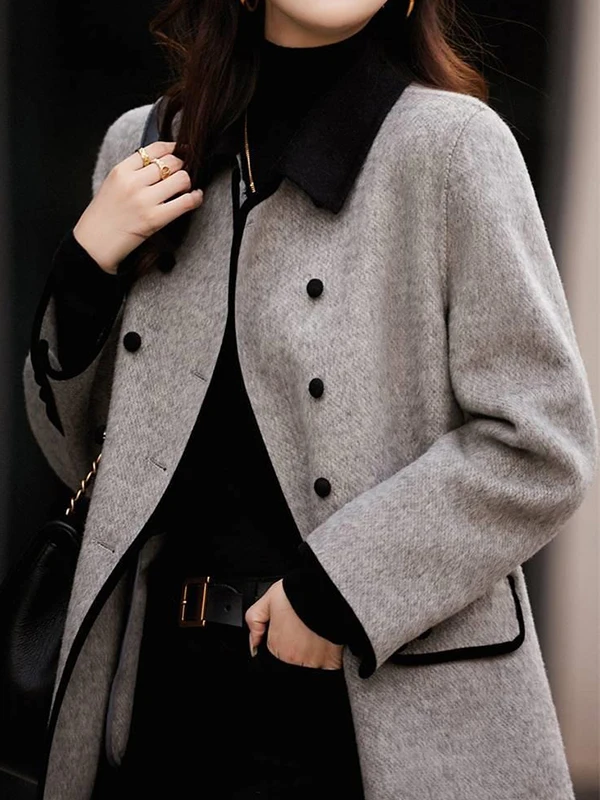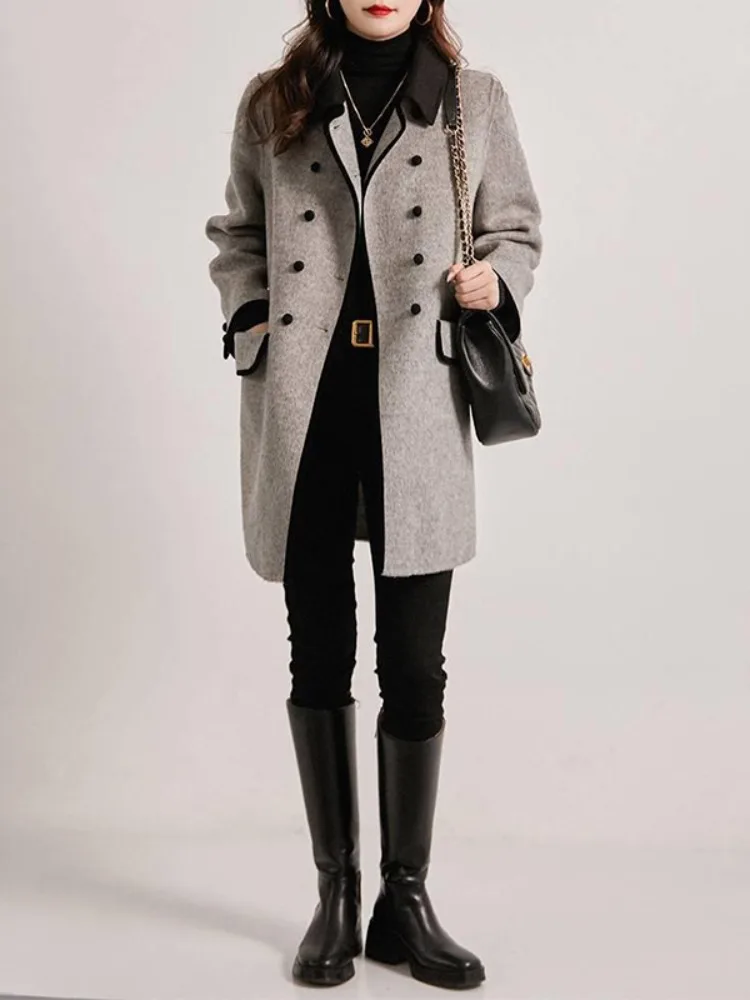 Onecozyday Cappotto doppiopetto grigio da donna Colletto dentellato Maniche lunghe Capispalla larghi 2025 Autunno Nuovi cappotti di tweed