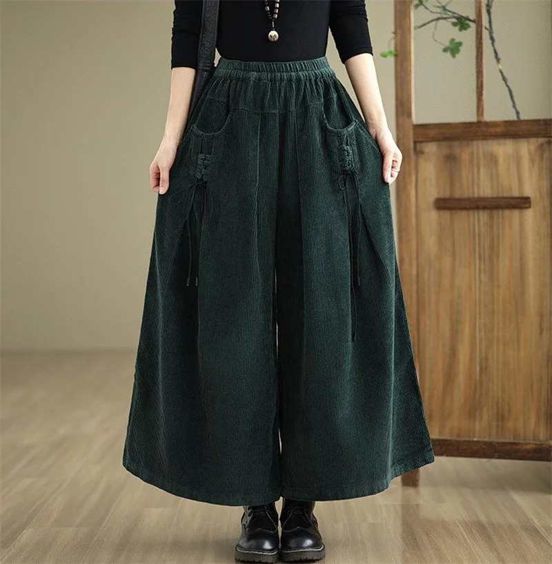 Pantaloni a gamba larga in velluto a coste Primavera Autunno da donna Pantaloni larghi taglie forti Culottes Tasca alla moda Gonna pantalone in vita elastica Donna