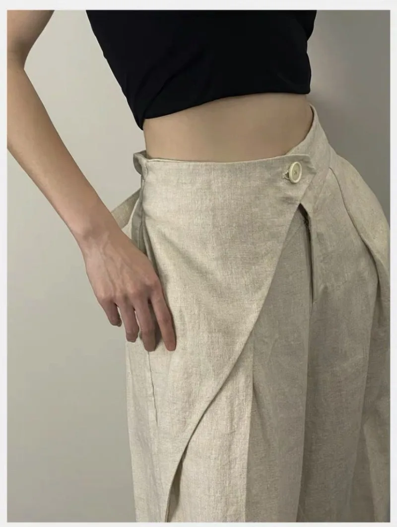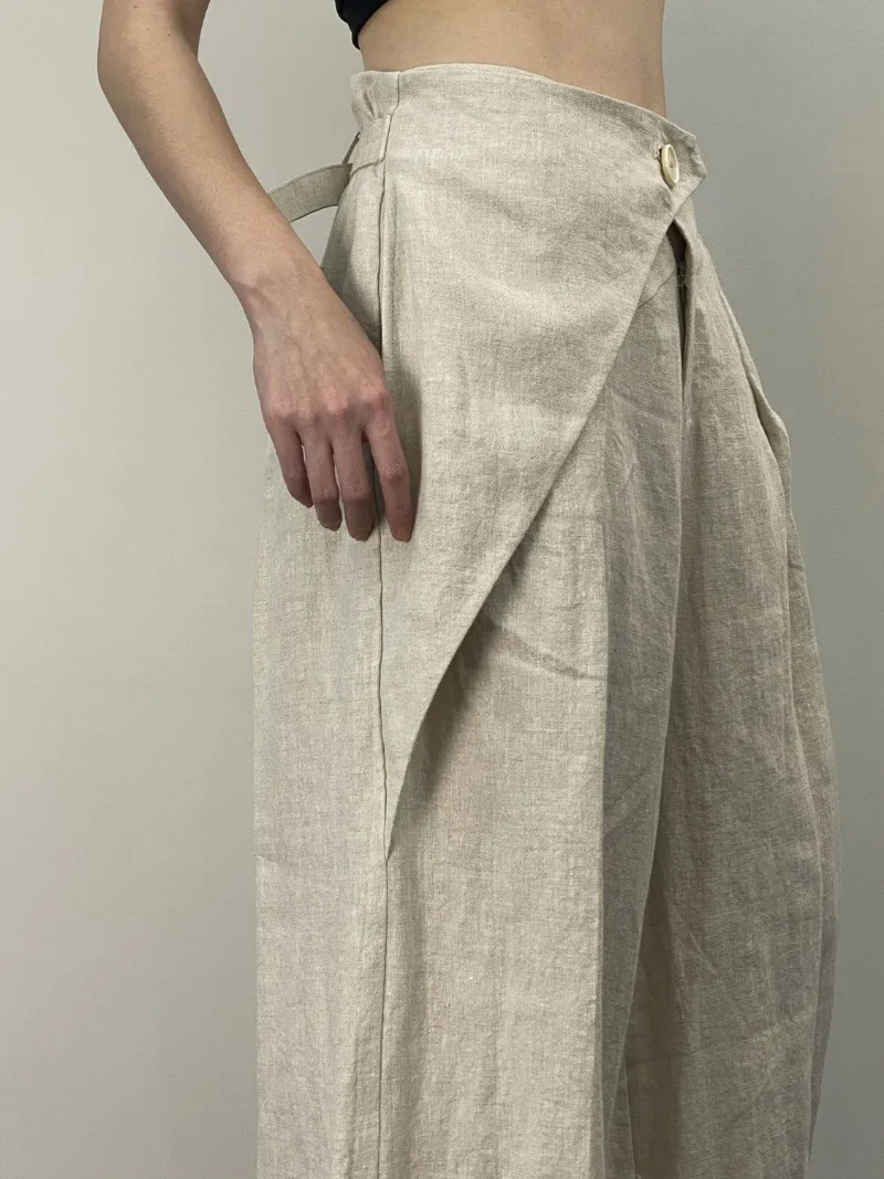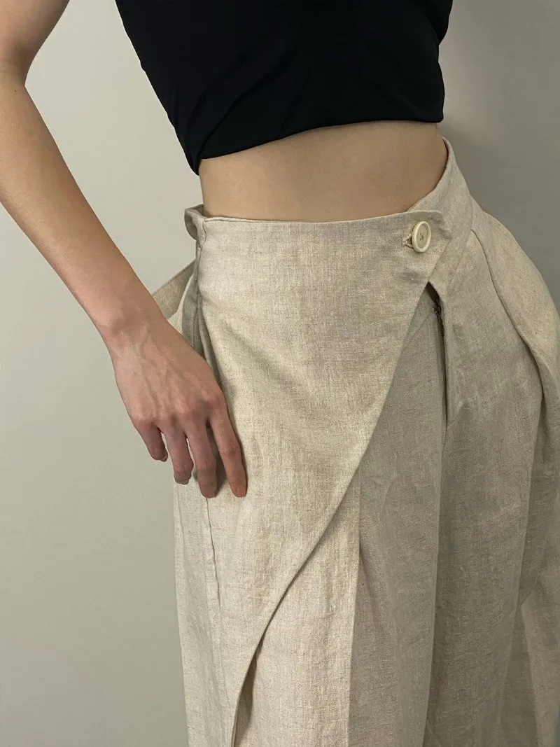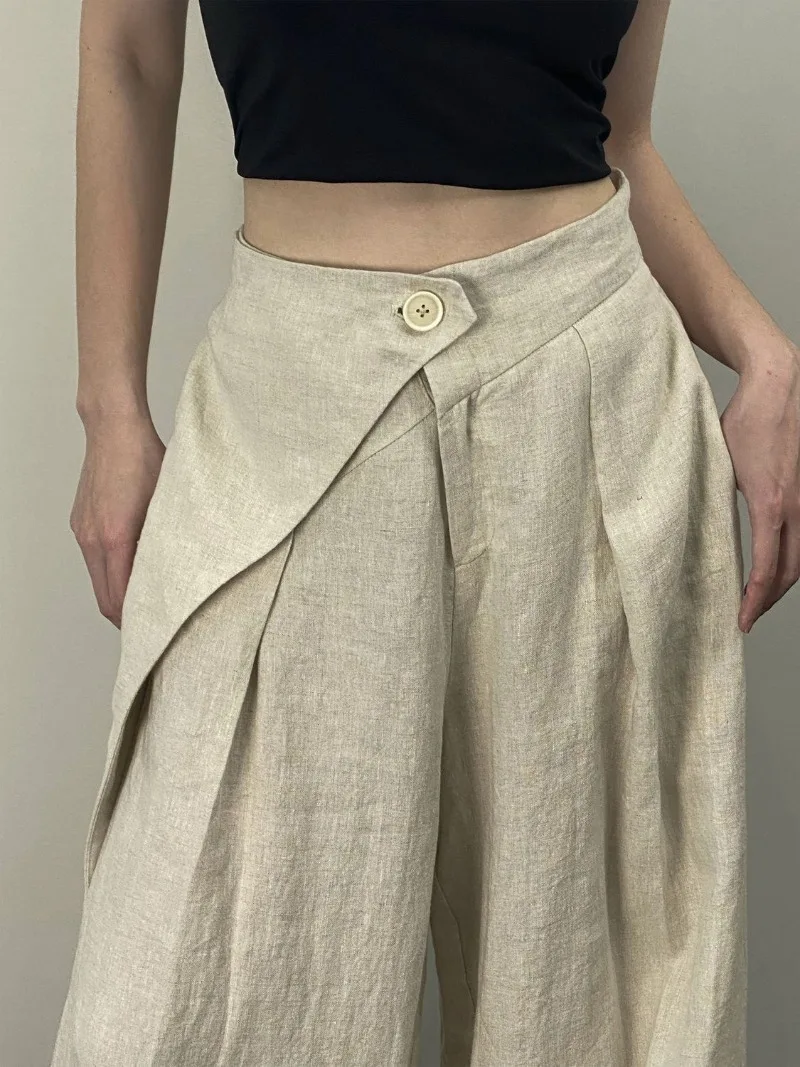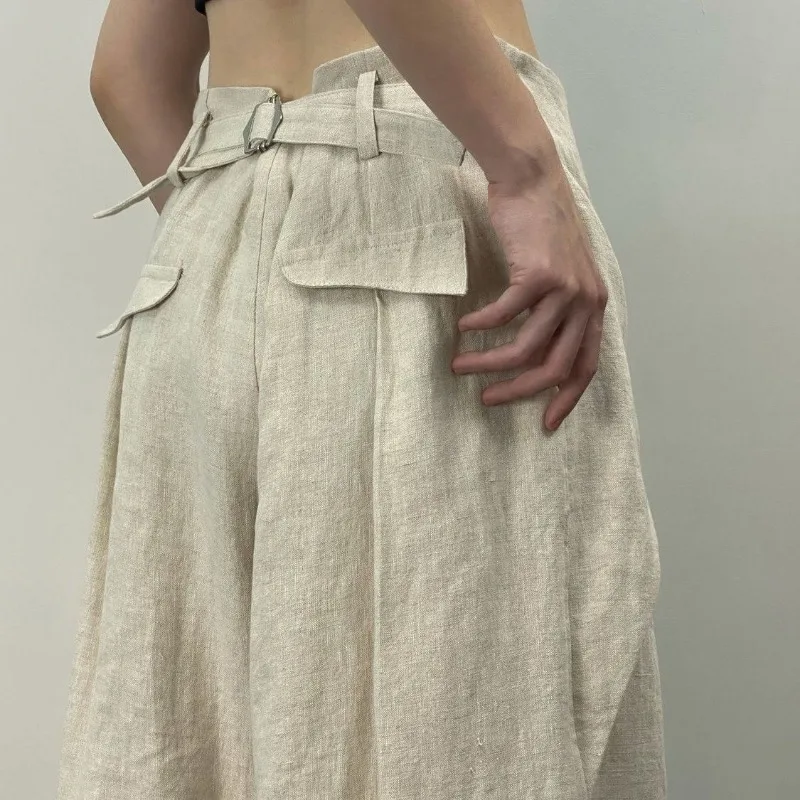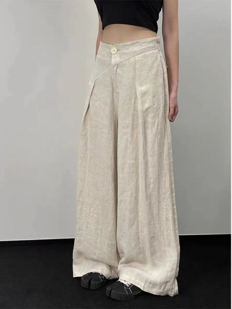 Pantaloni a gamba larga pieghettati casual da donna alla moda chic Texture in lino Pantaloni larghi a vita alta tutti abbinati Mujer Pantalones