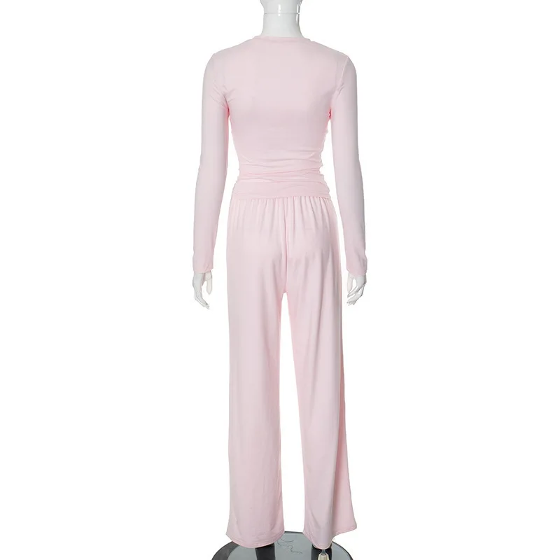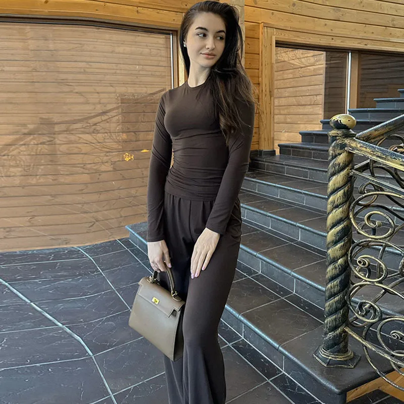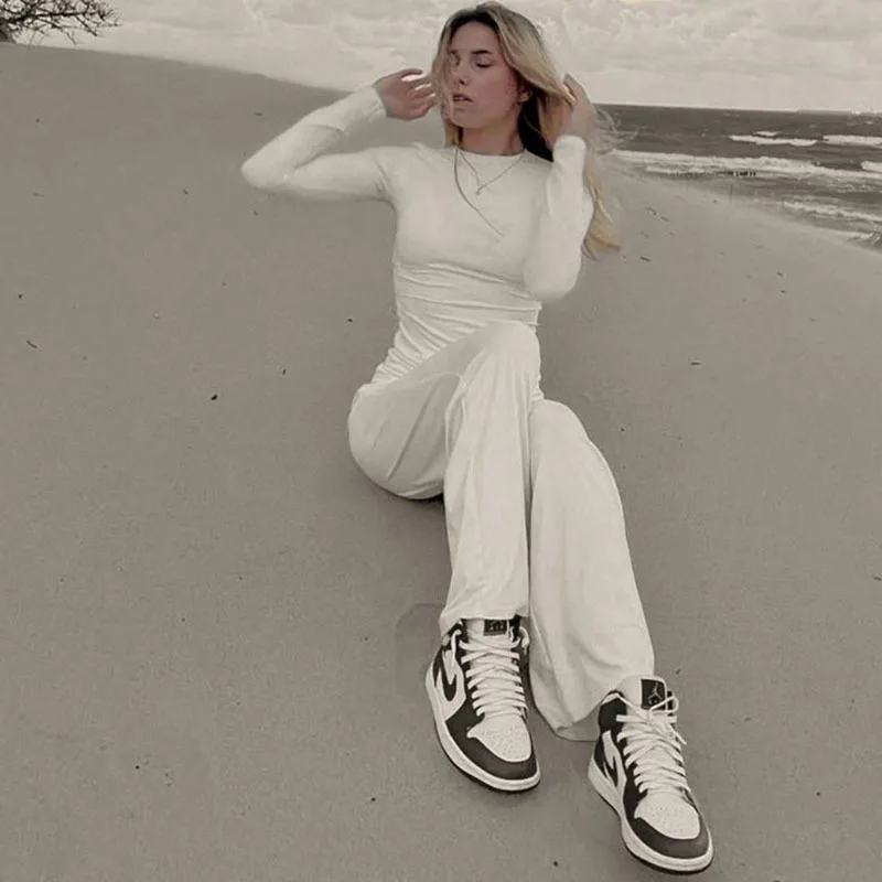 Pantaloni basic casual plissettati solidi appraenti Set girocollo manica lunga Top moda sportiva stile pantaloni a gamba larga a vita alta