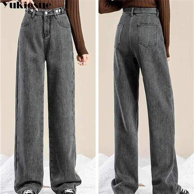 Pantaloni da donna 2023 moda invernale edizione coreana nuovo stile versatile vita alta cilindro dritto jeans a gamba larga in pile spesso