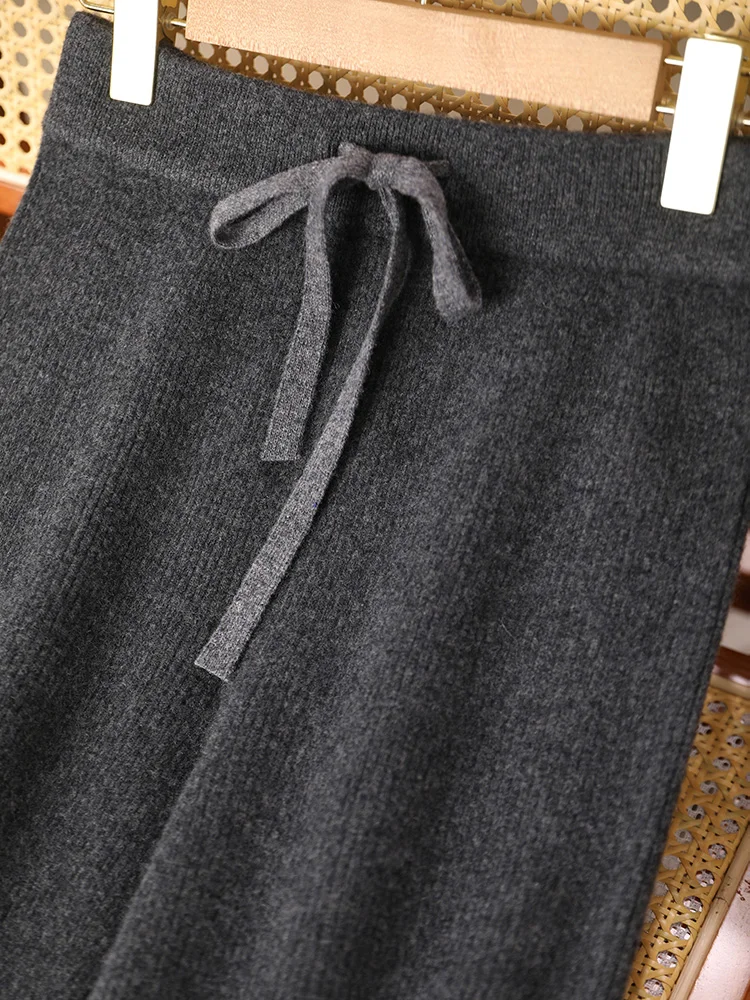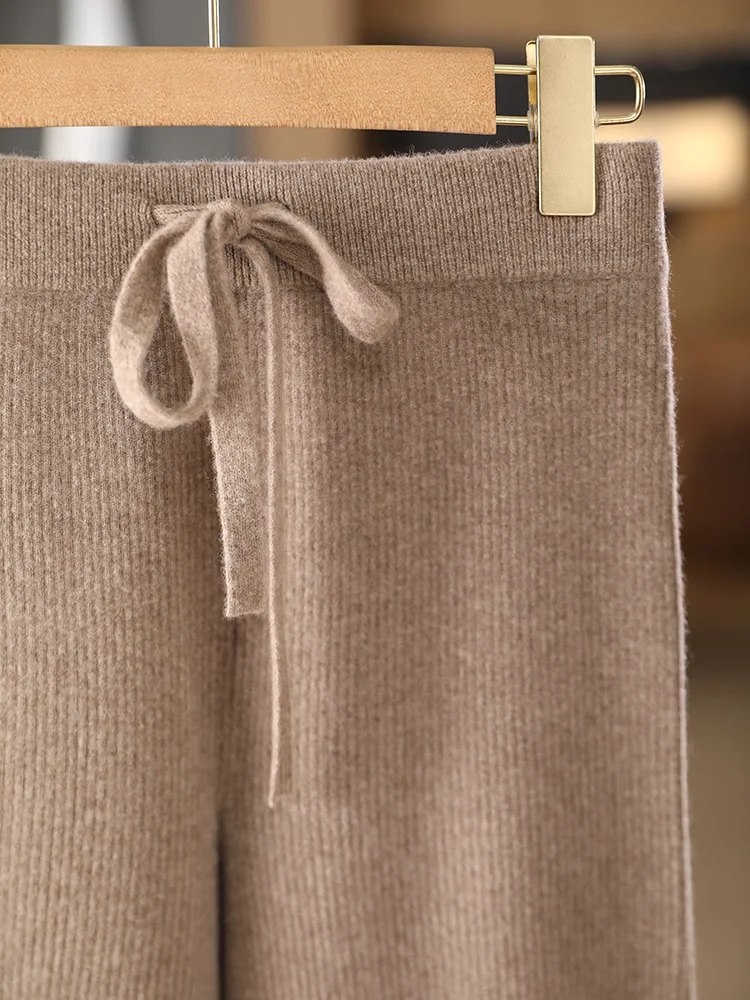 Pantaloni larghi in lana da donna chic Vita elastica in cashmere a righe Autunno Inverno 100% lana merino Maglieria Pantaloni casual semplici