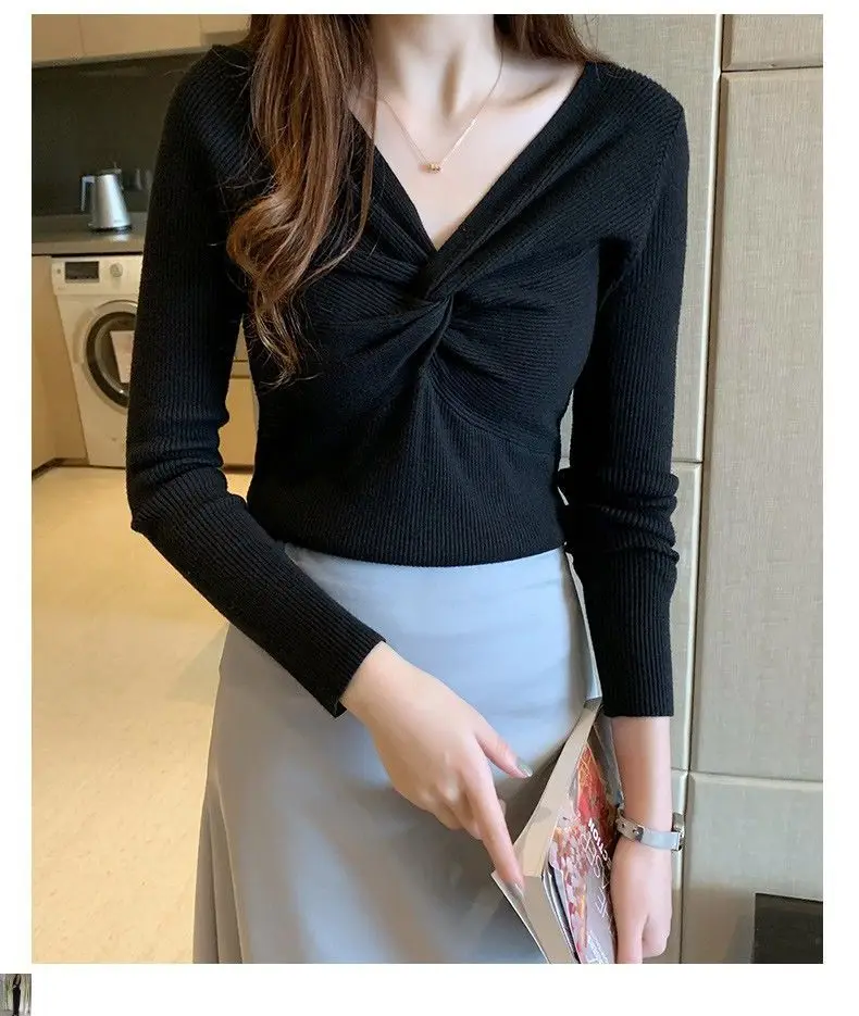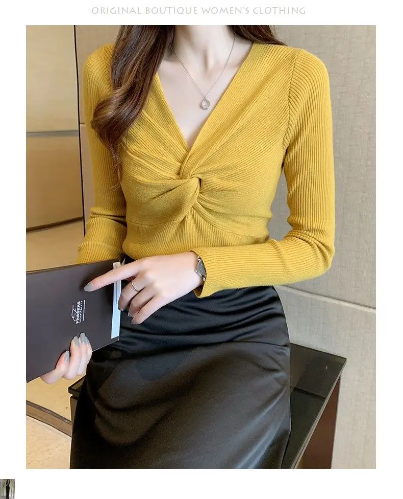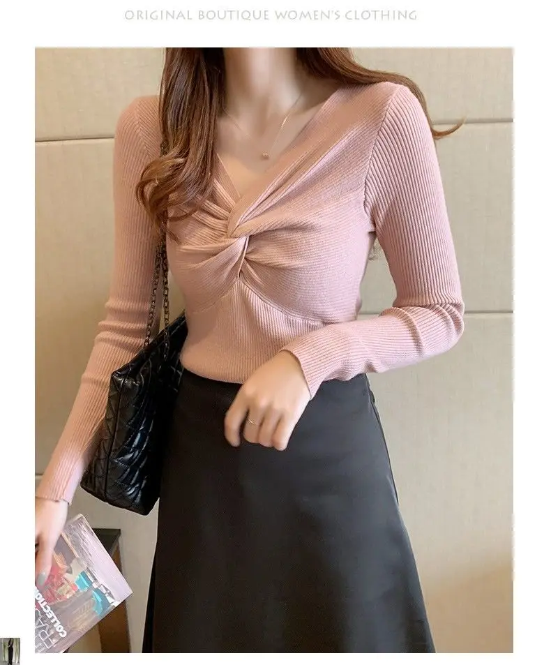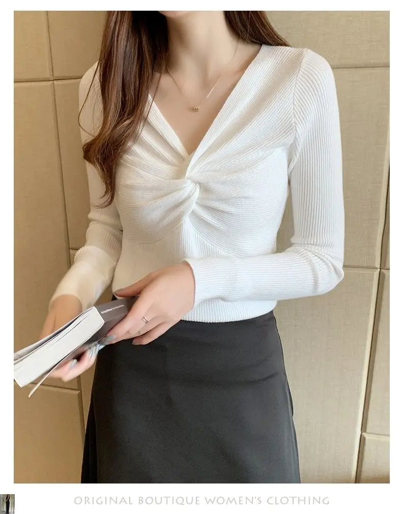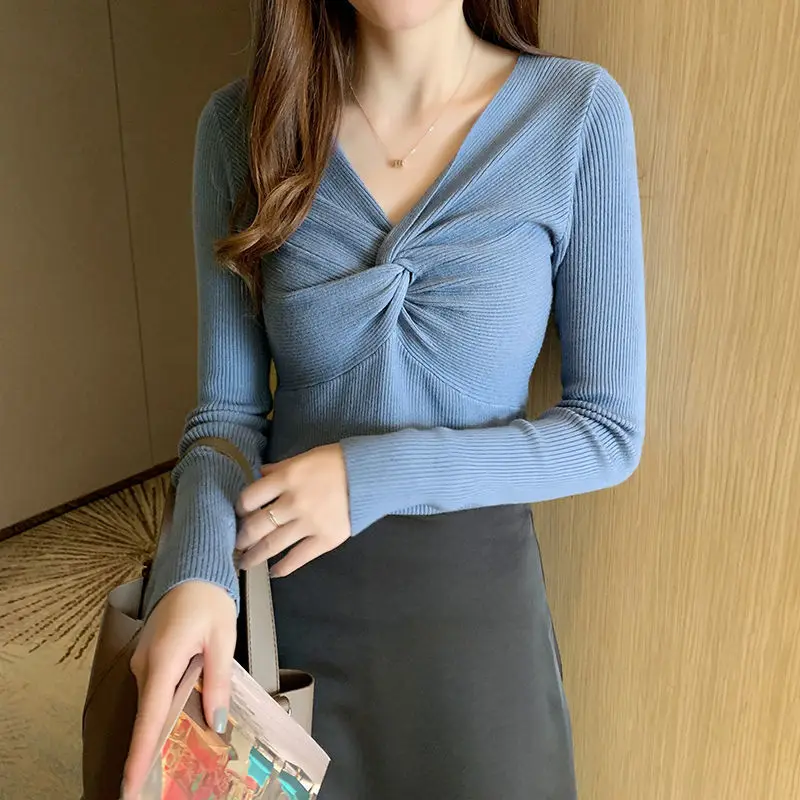 Primavera autunno Slim pullover lavorati a maglia abbigliamento donna coreana moda pieghe Casual tinta unita tutto-fiammifero elegante t-shirt con scollo a v