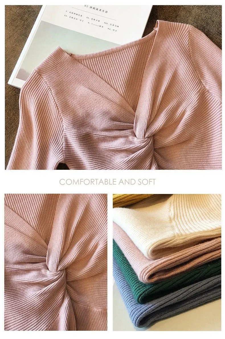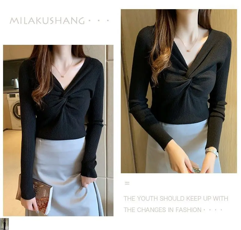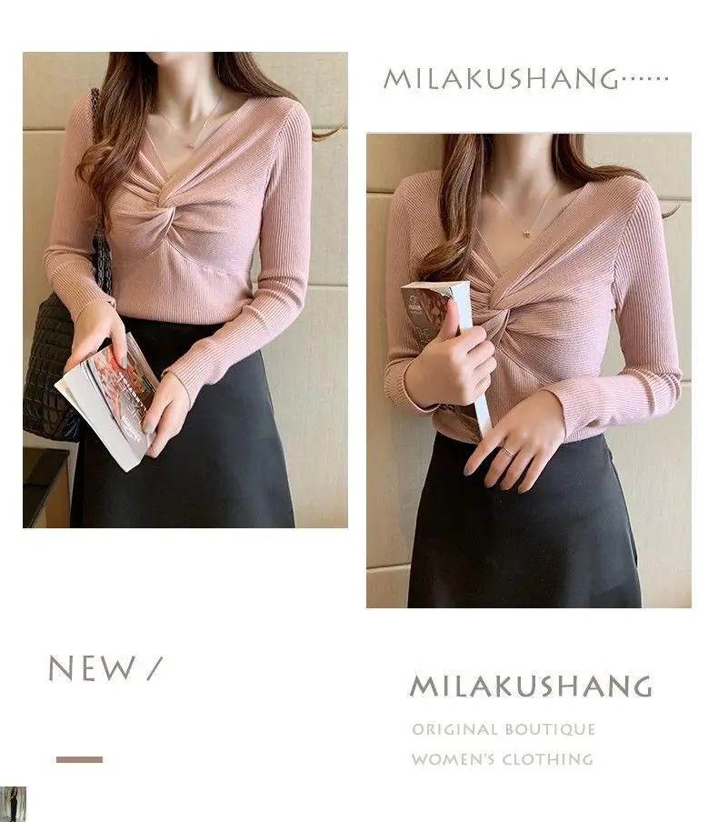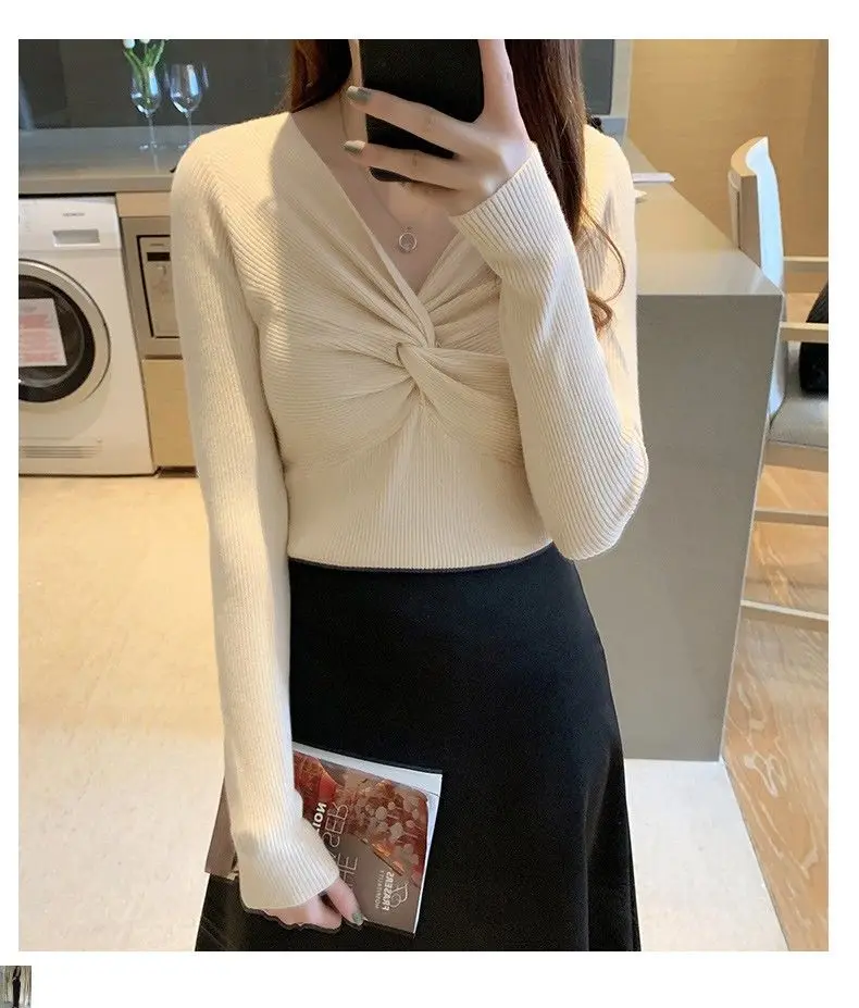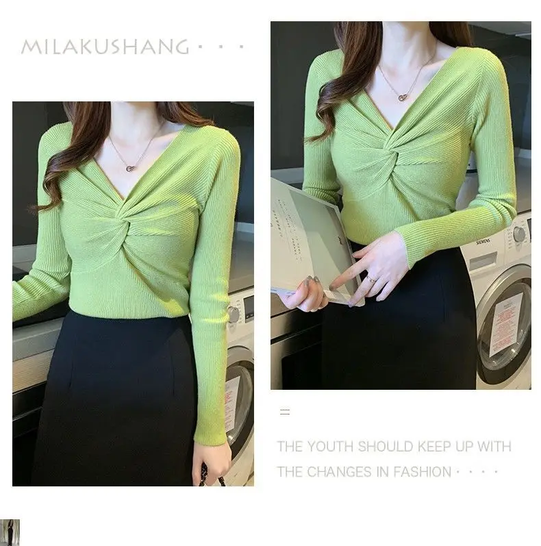 Primavera autunno Slim pullover lavorati a maglia abbigliamento donna coreana moda pieghe Casual tinta unita tutto-fiammifero elegante t-shirt con scollo a v