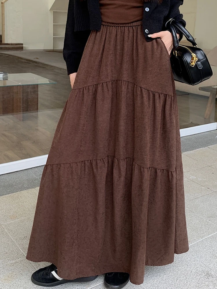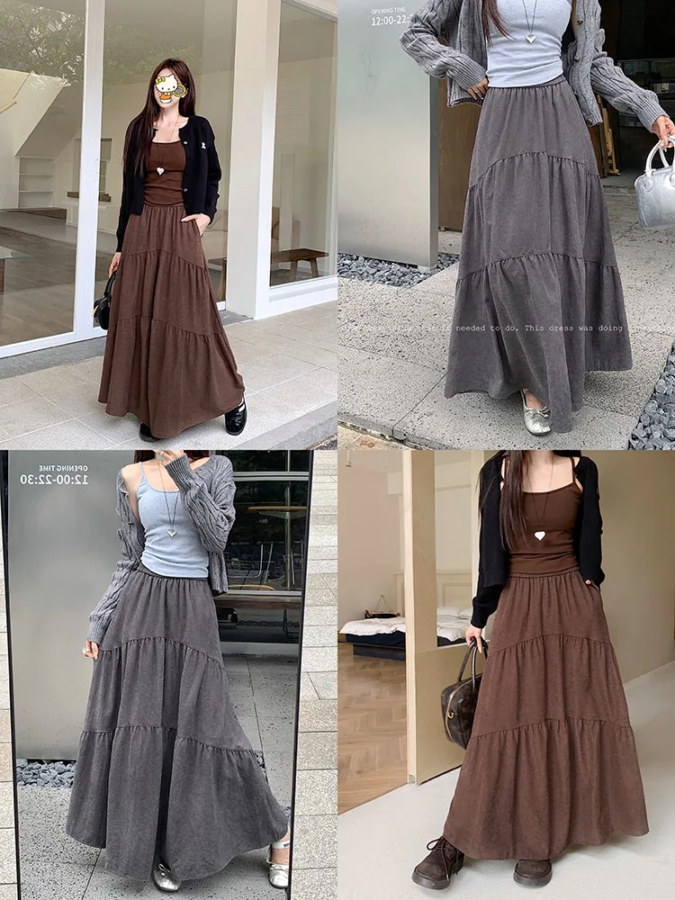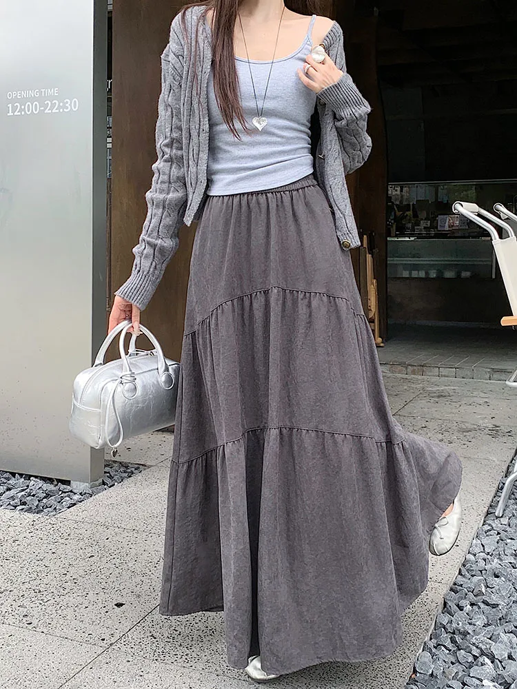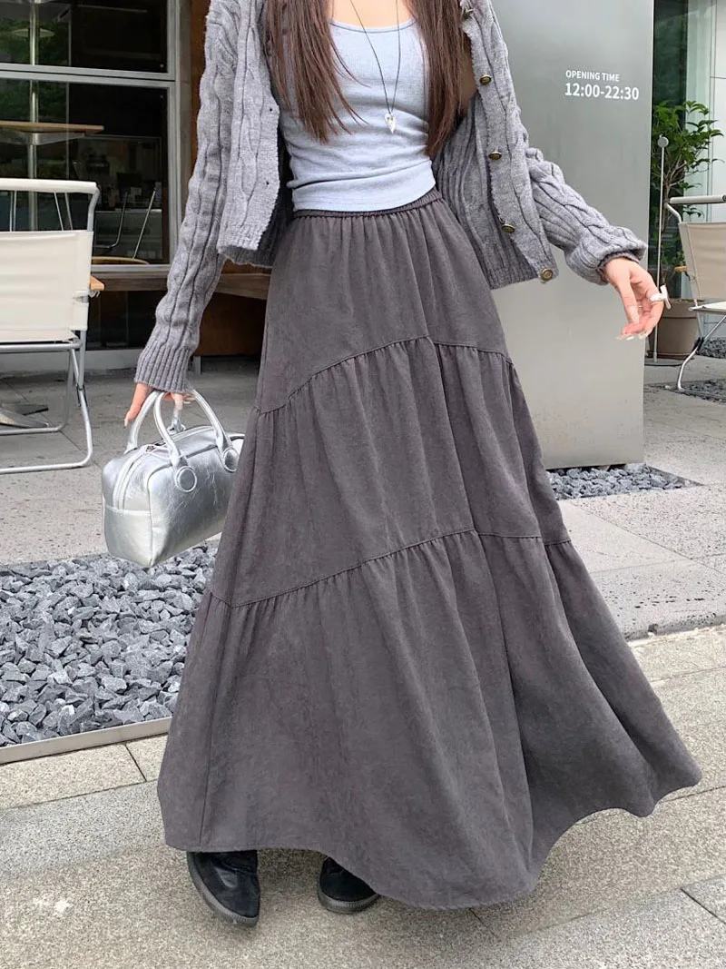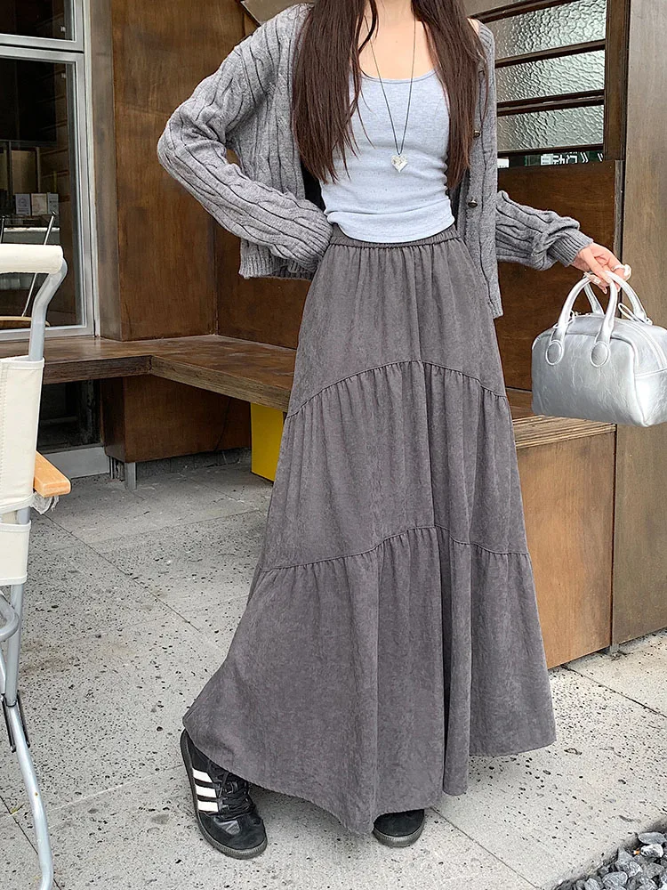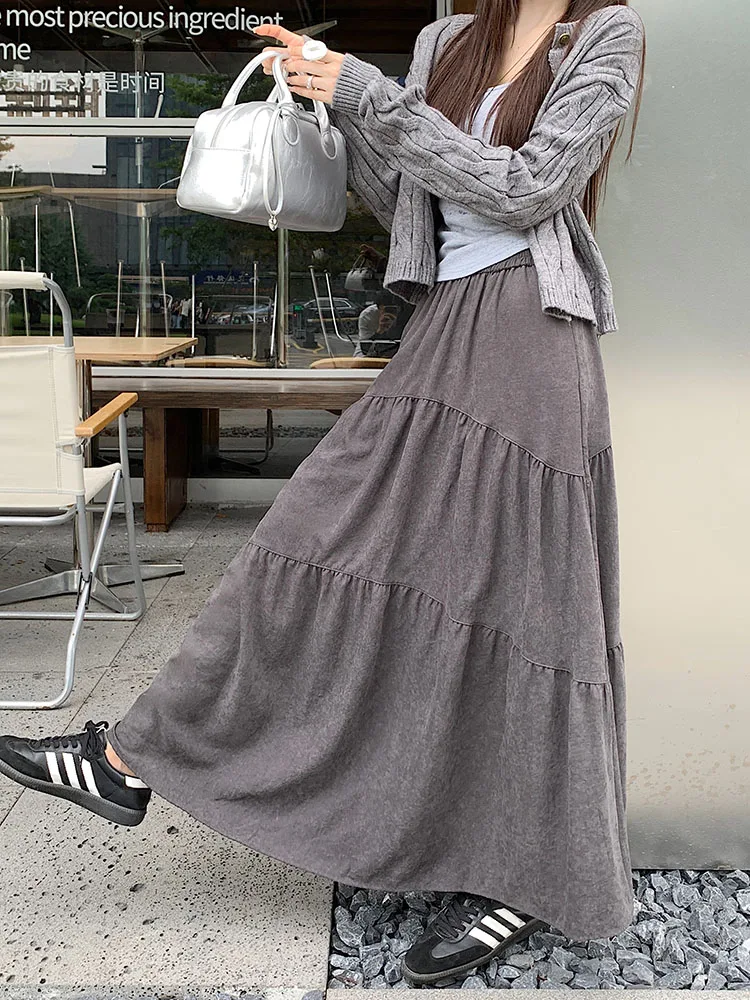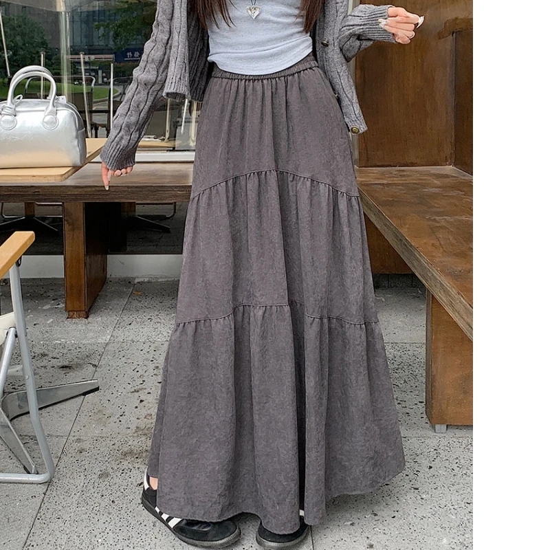 Qiukichonson Gonna lunga maxi grigia Donna 2024 Moda coreana Autunno Inverno Casual Gonne a pieghe con volant a vita alta 90 cm Rok