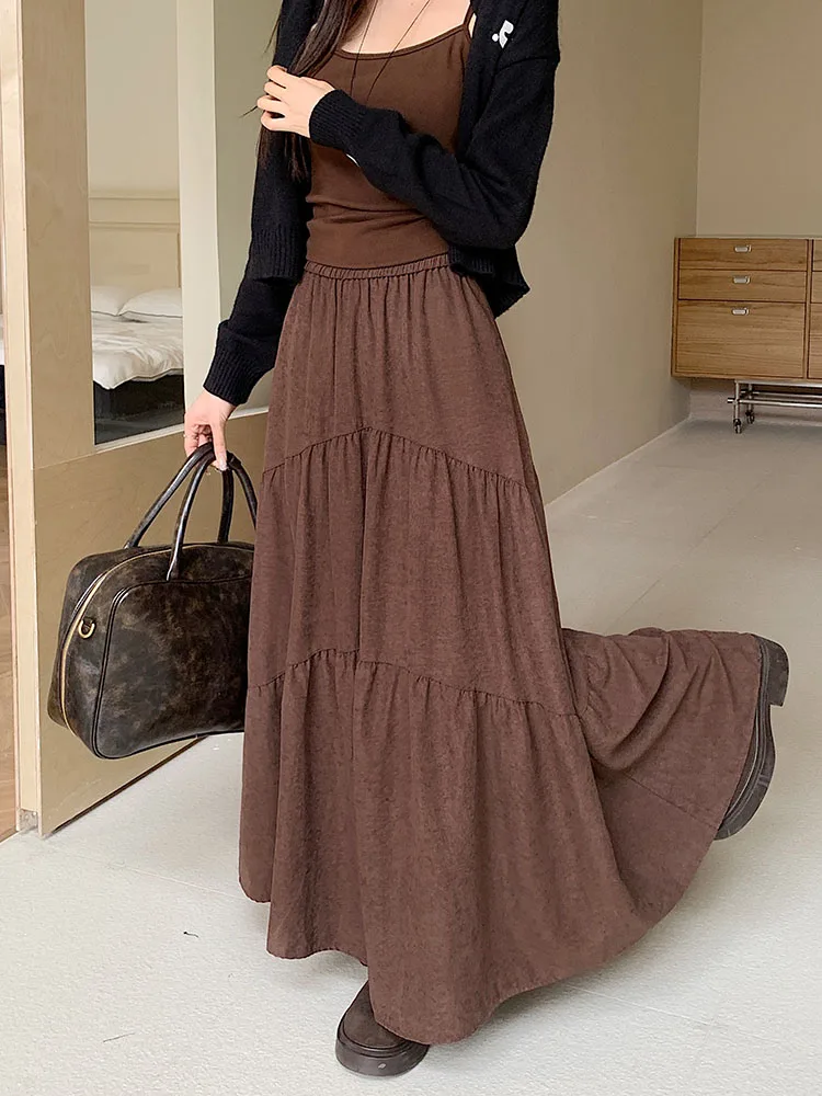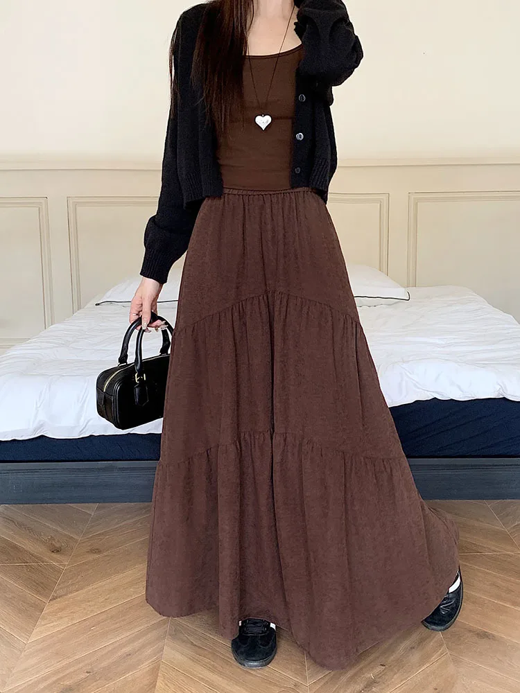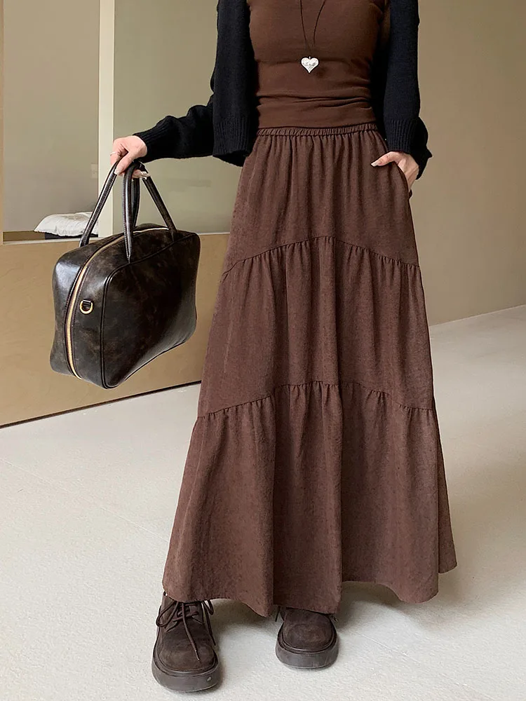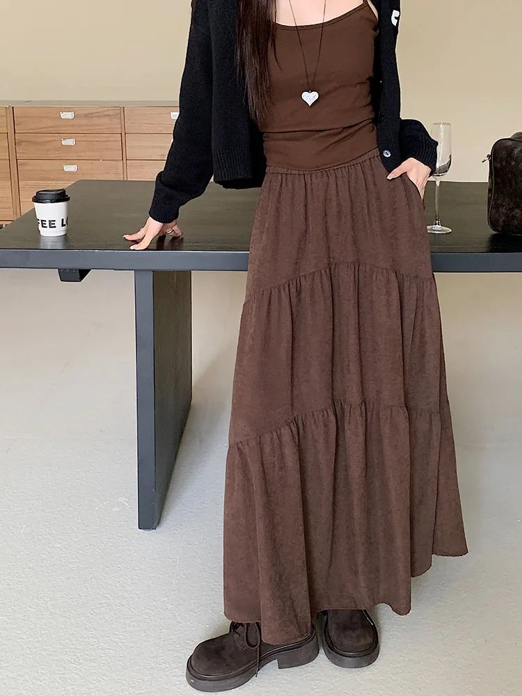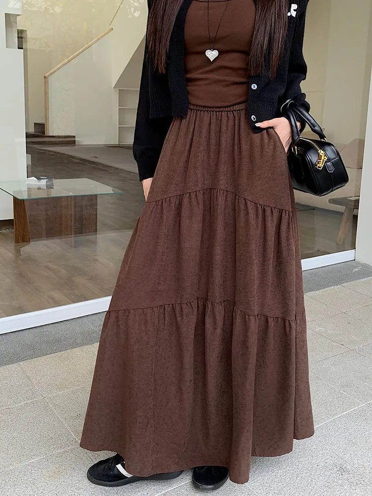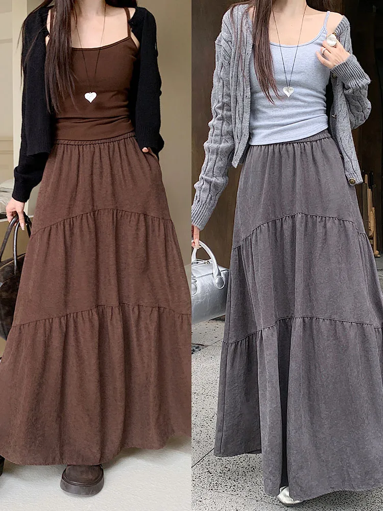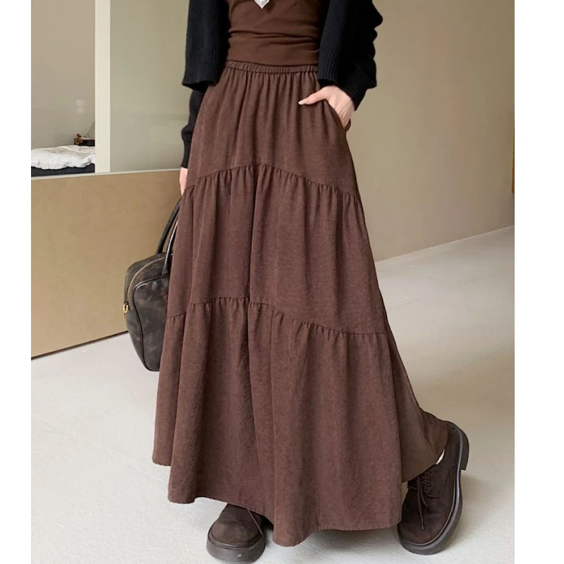 Qiukichonson Gonna lunga maxi grigia Donna 2024 Moda coreana Autunno Inverno Casual Gonne a pieghe con volant a vita alta 90 cm Rok