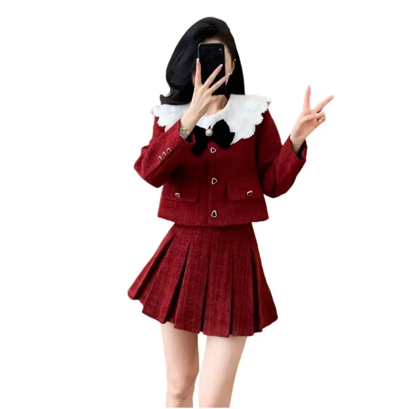 Real Shot Autunno Inverno New Rich Family Heriress Stile classico Colletto per bambola Giacca corta con giunture in pizzo Gonna a pieghe Set da due pezzi
