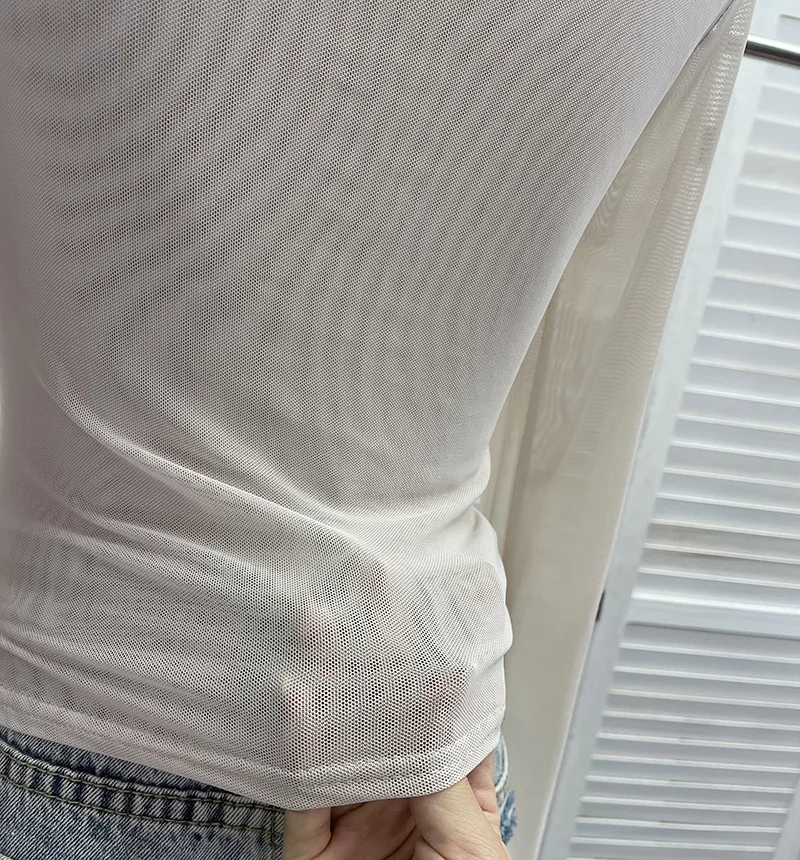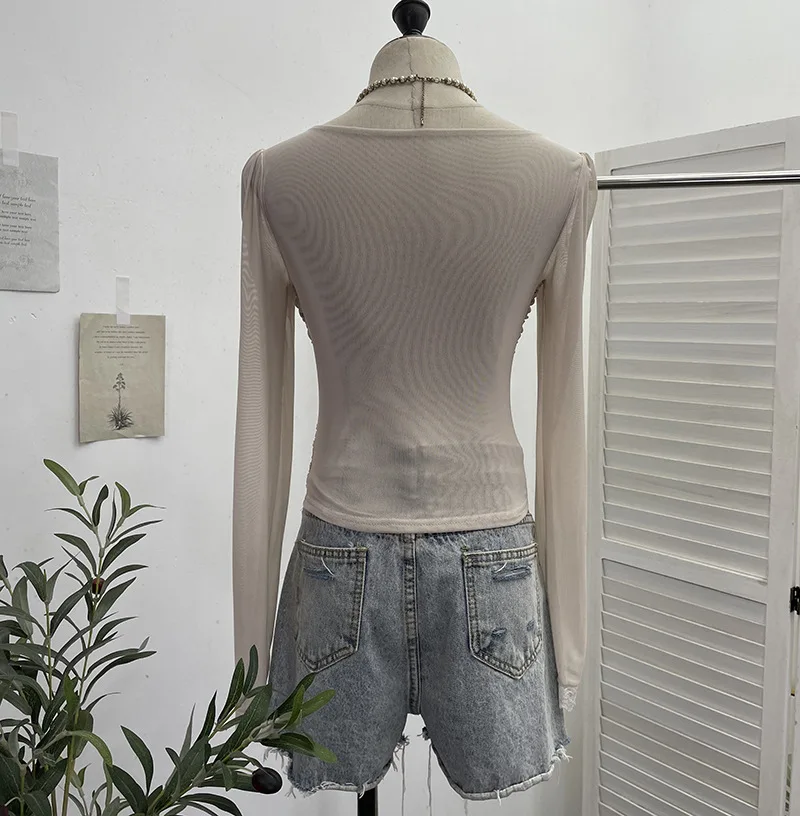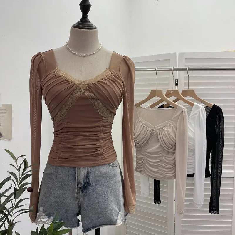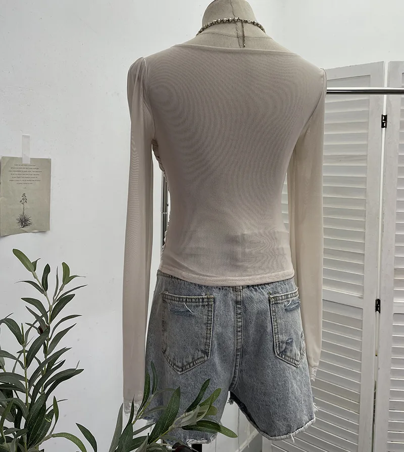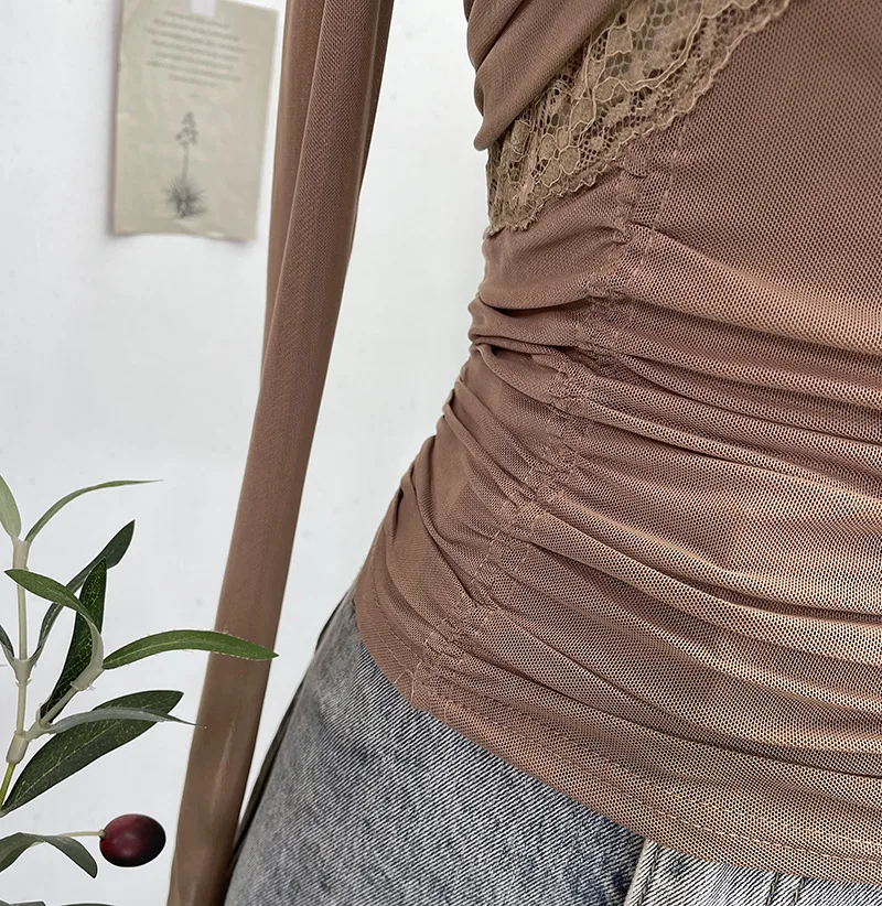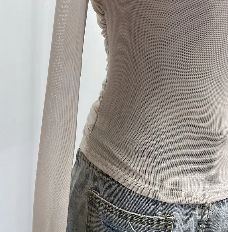T-shirt a maniche lunghe in rete impiombata con pizzo rivelatore del seno imbottito sexy da donna T-shirt corta slim fit Y2K Top Partyclub Leisure 2673
