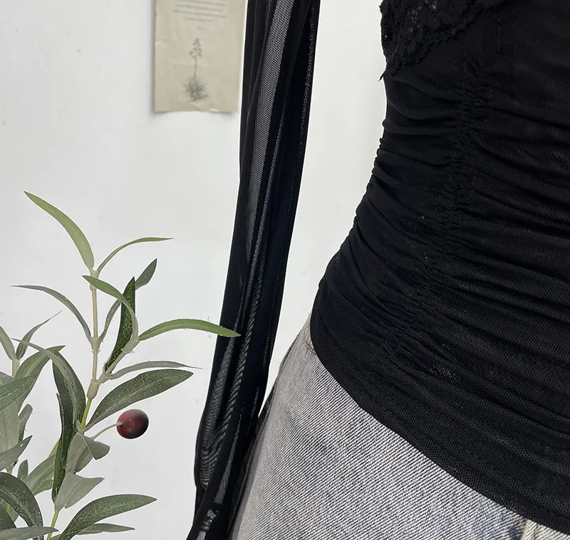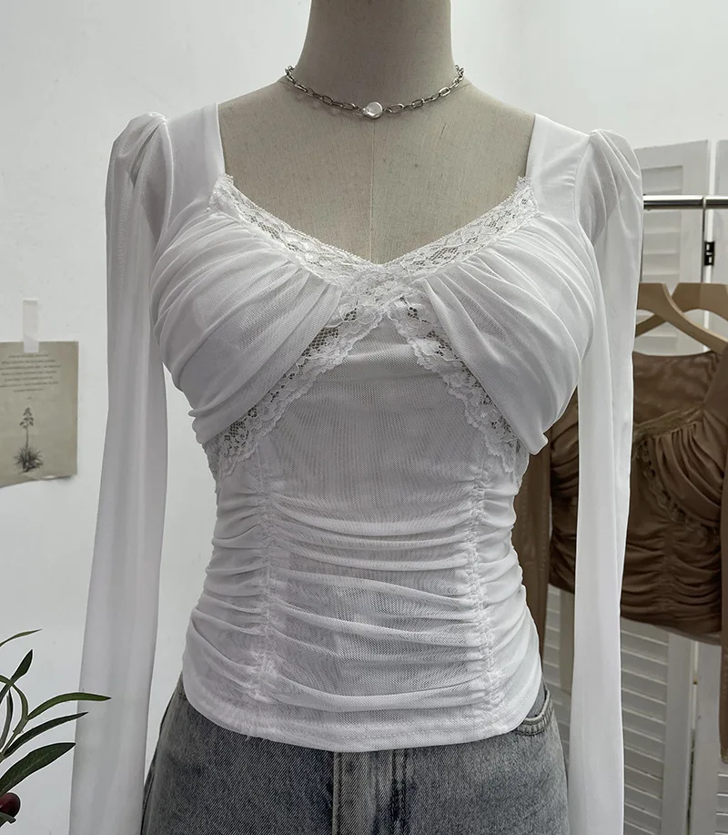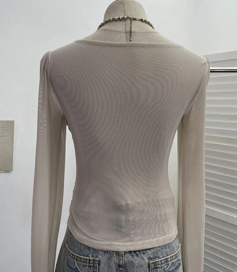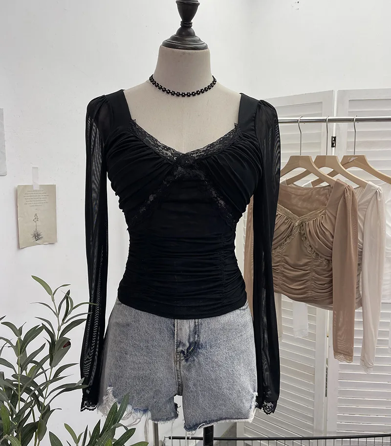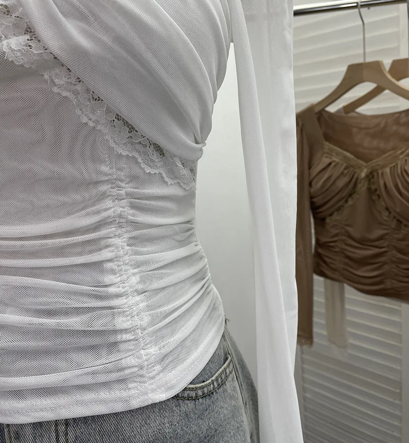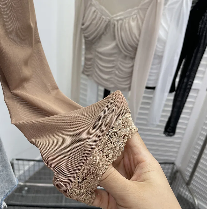 T-shirt a maniche lunghe in rete impiombata con pizzo rivelatore del seno imbottito sexy da donna T-shirt corta slim fit Y2K Top Partyclub Leisure 2673