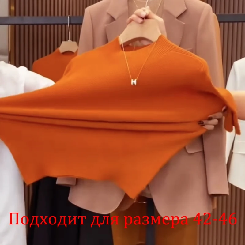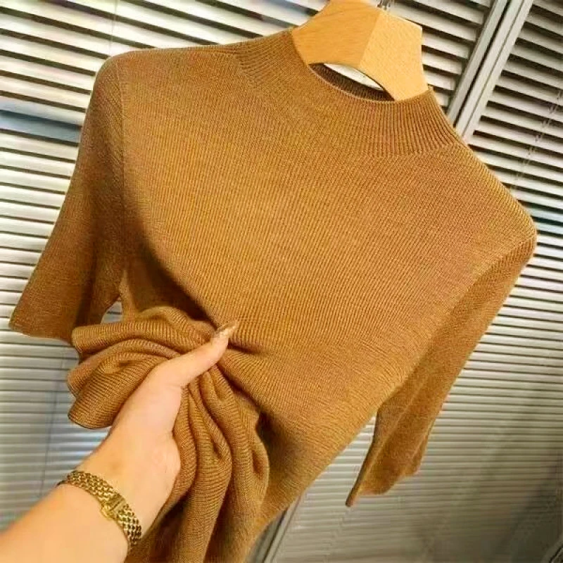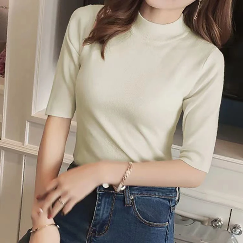 Top da donna in tinta unita con colletto alla coreana, mezza manica, casual, sottile, in maglia elastica alta, basic, morbido, autunno/primavera