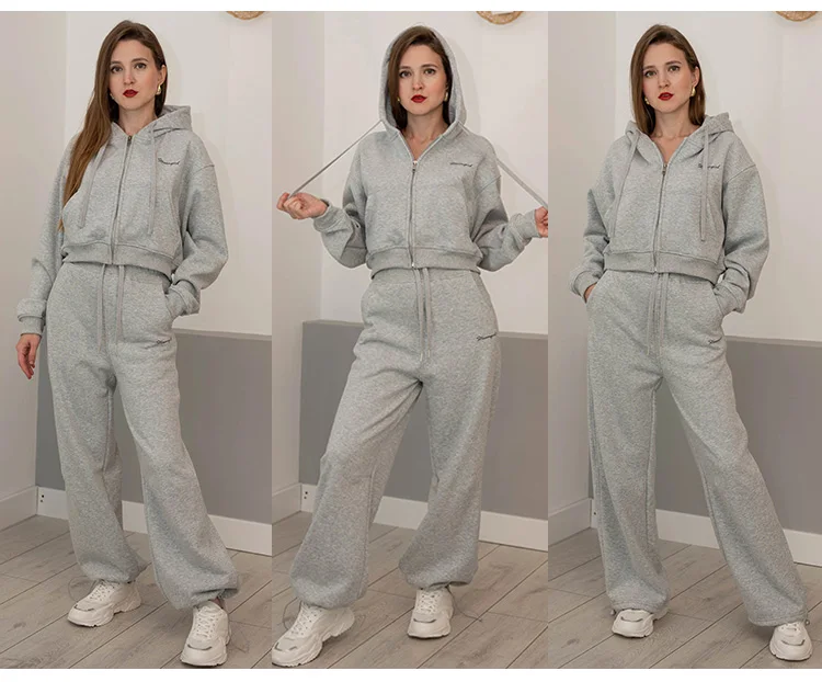 Tute da donna Tuta in pile invernale Marrone caldo Crop Zipper Felpe con cappuccio e pantaloni sportivi Set per donna Set di pantaloni in velluto da 2 pezzi