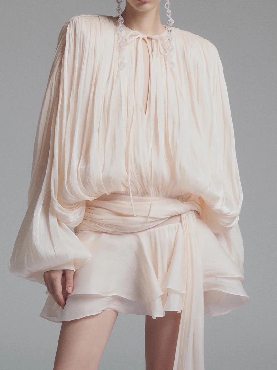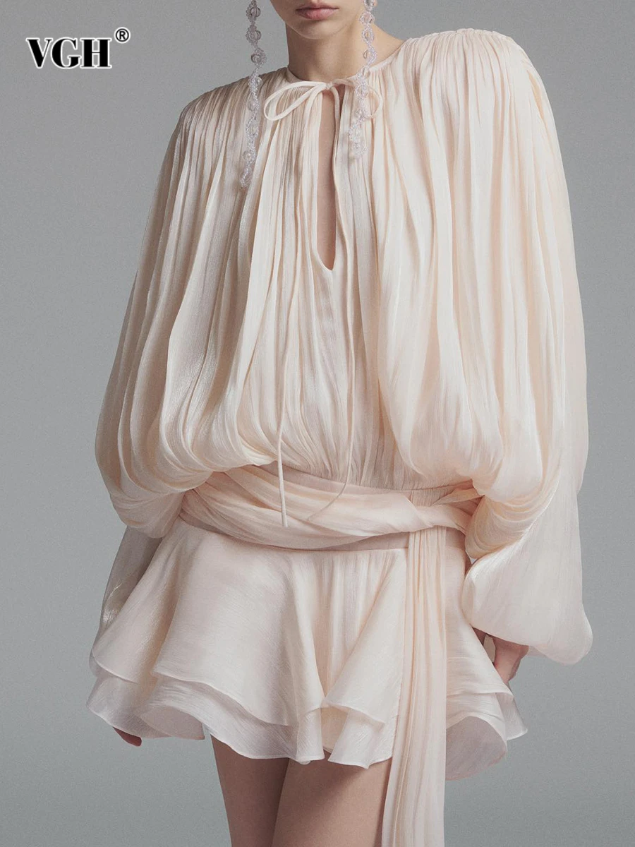 VGH Chic Impiombato Lace Up Abiti corti sexy allentati per le donne Girocollo Manica lunga Minimalista Ruffles Pieghe Abito Moda femminile
