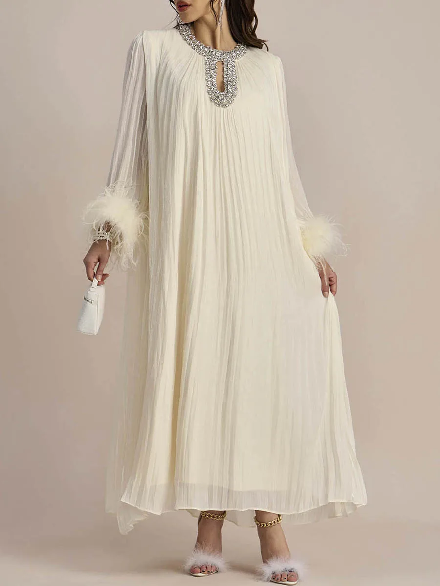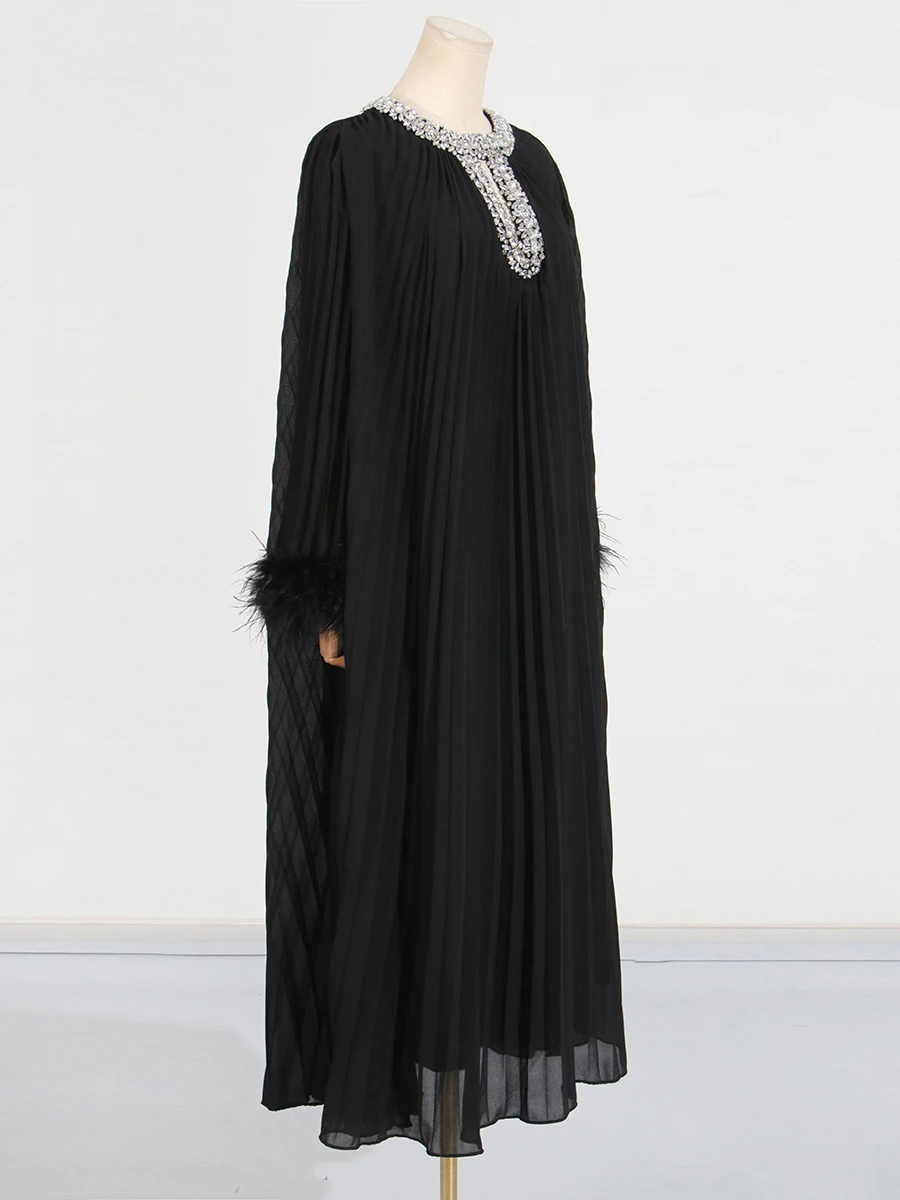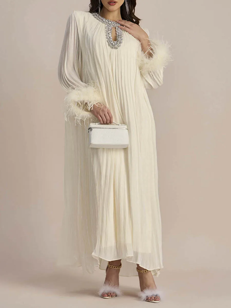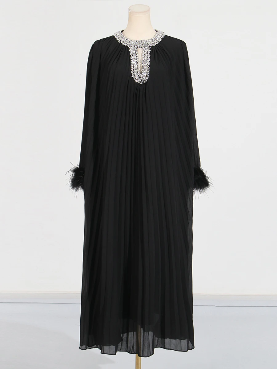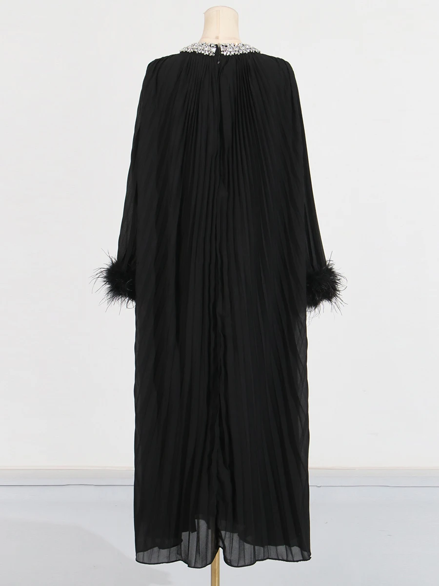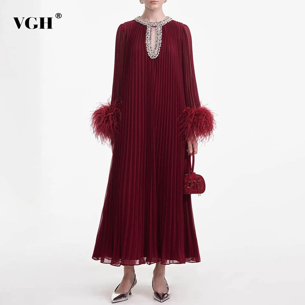 VGH Minimalista Diamanti Impiombati Abiti A Pieghe Allentati Per Le Donne O Collo Manica Lunga Patchwork Piume Scava Fuori Il Vestito Femminile