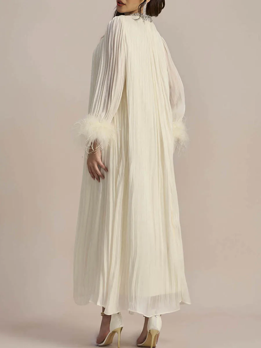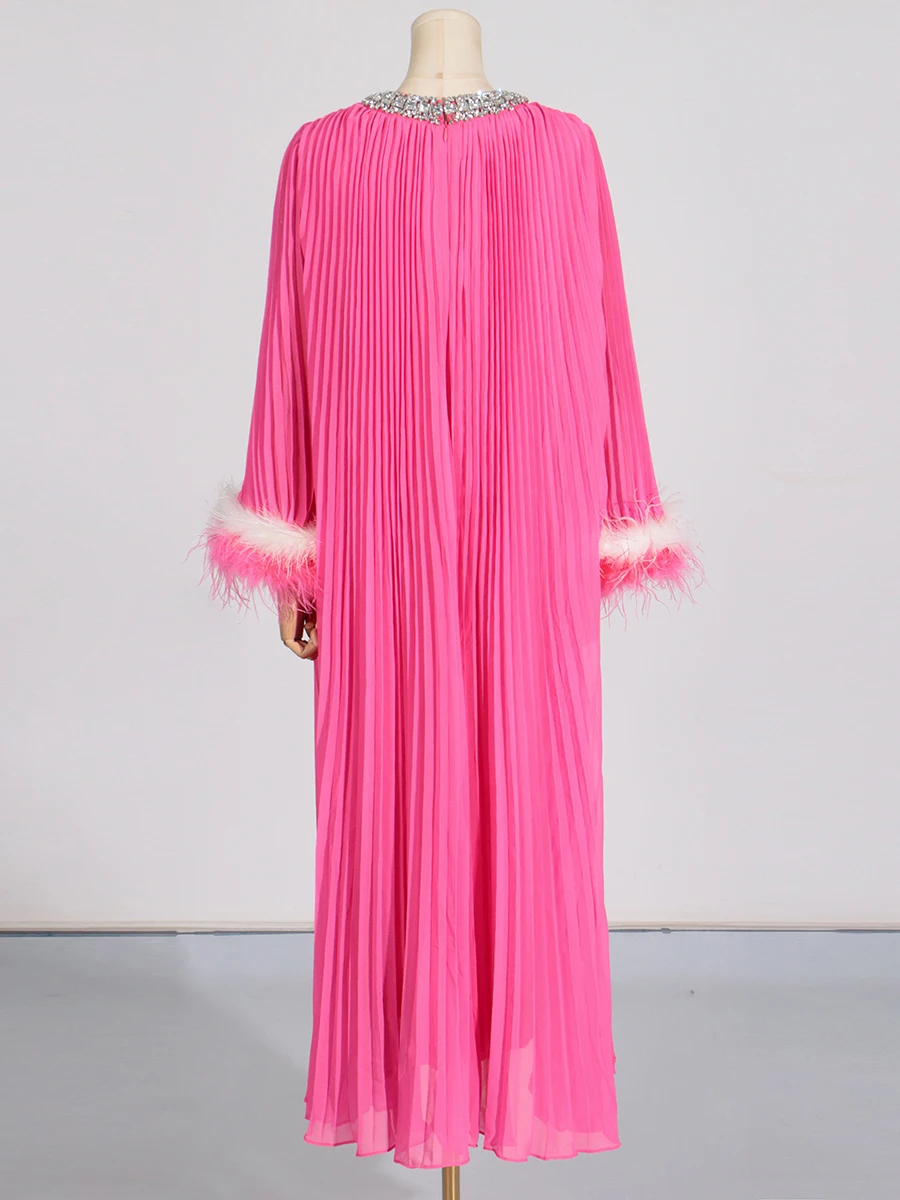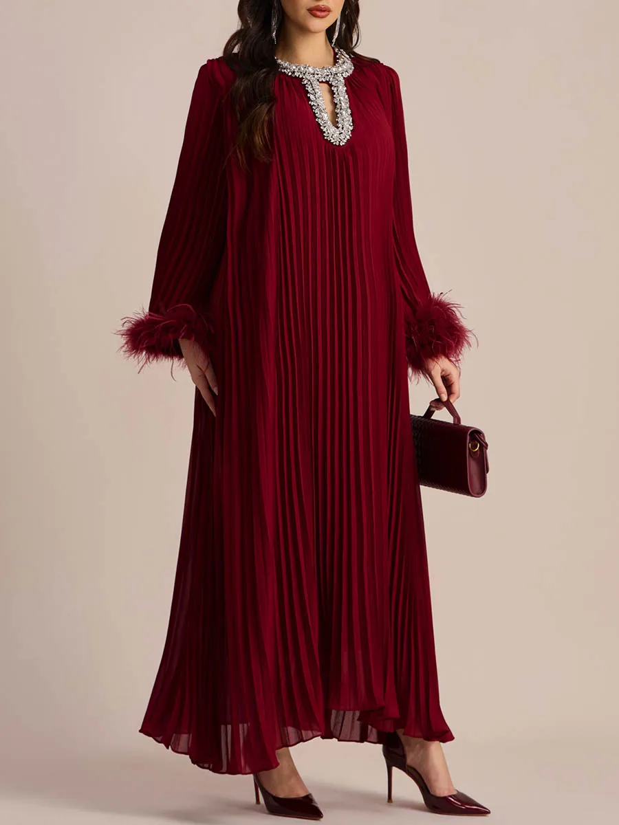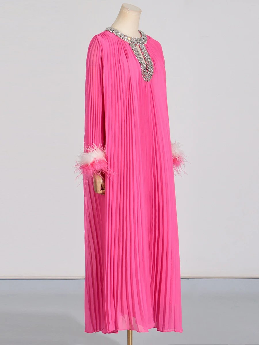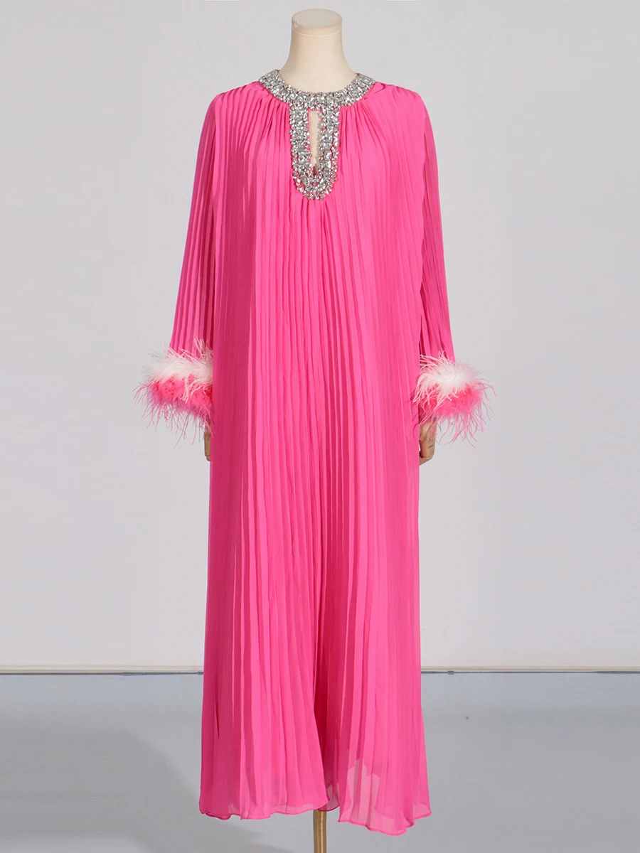 VGH Minimalista Diamanti Impiombati Abiti A Pieghe Allentati Per Le Donne O Collo Manica Lunga Patchwork Piume Scava Fuori Il Vestito Femminile