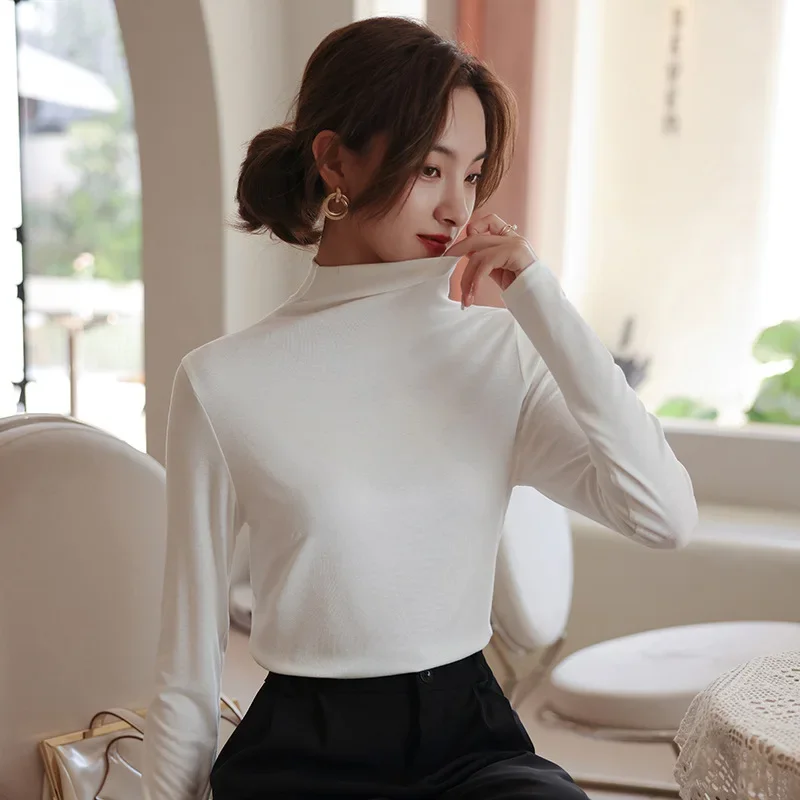 YSZWDBLX T-shirt da donna Autunno Inverno Manica lunga Mezza collo alto Camicia con fondo in modale morbido Ad alta resistenza Abbigliamento interno caldo coreano