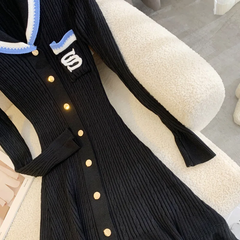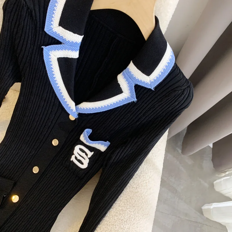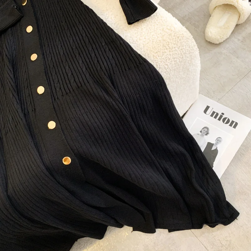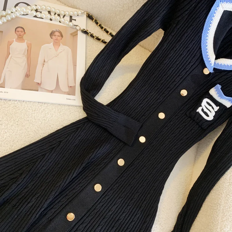 YuooMuoo Abito lungo lavorato a maglia con lettera ricamata elegante Autunno Inverno Marchio di moda Lady Abito maglione nero dentellato Abiti da ufficio