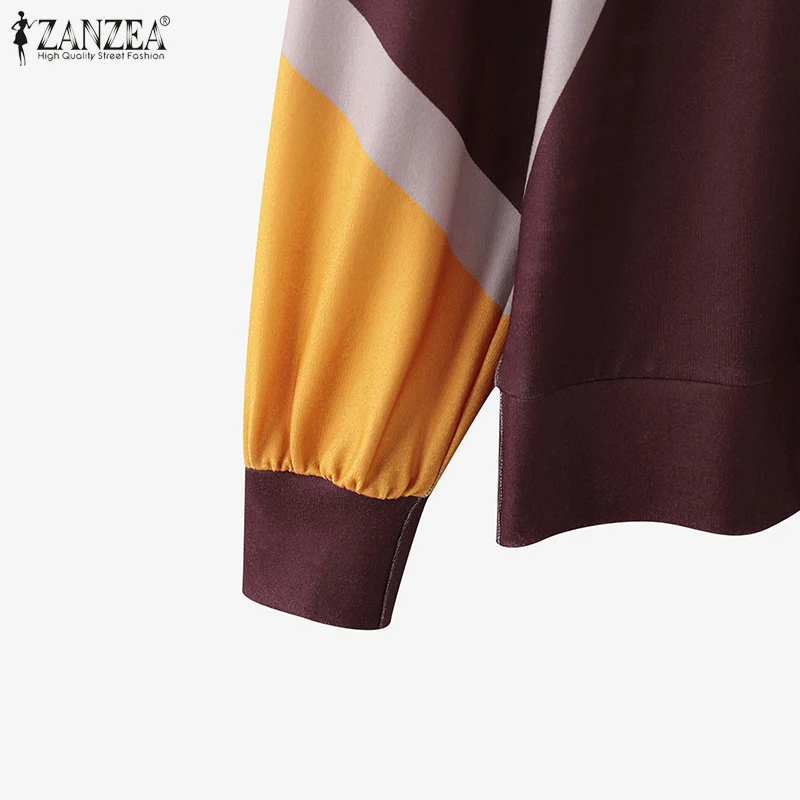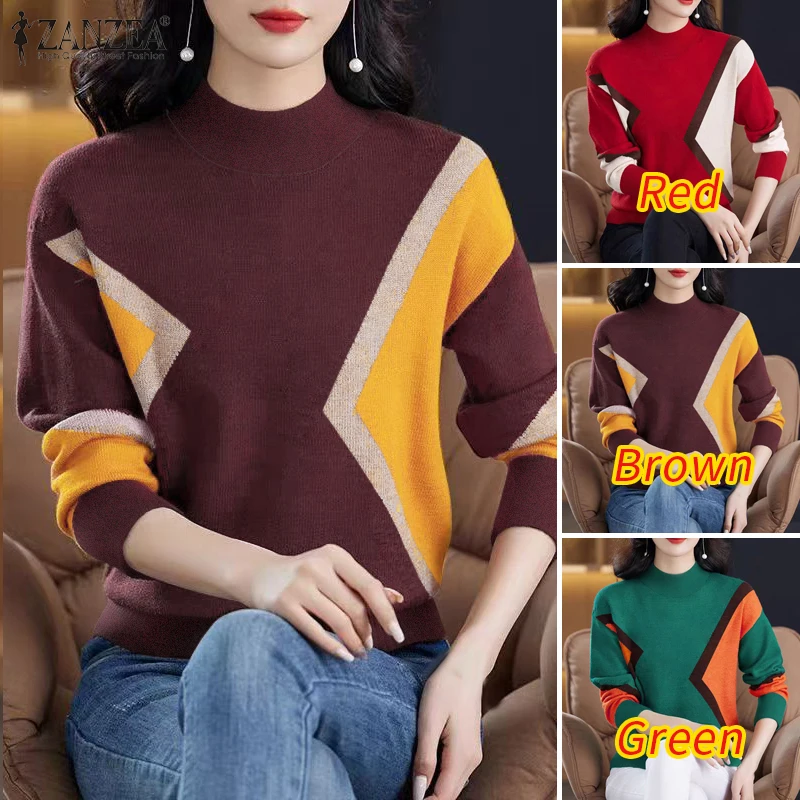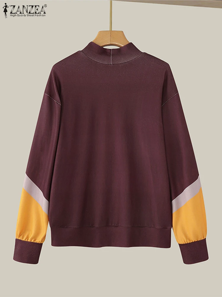 ZANZEA 2025 Donne di Autunno Elegante Collo Alto Lavorato A Maglia Magliette Casual A Maniche Lunghe T-Shirt Moda Colorblock Magliette e camicette Patchwork Tuniche