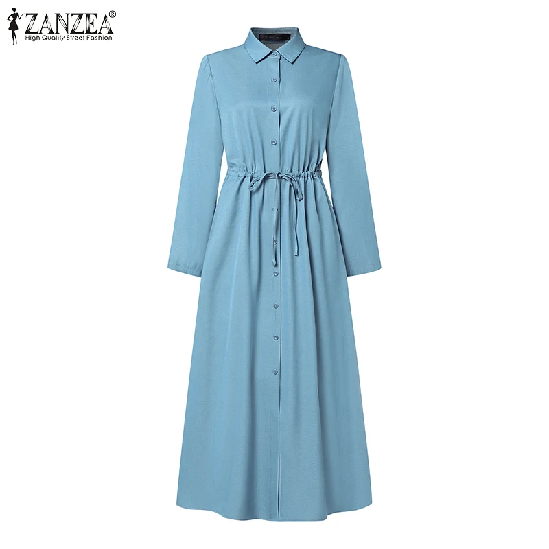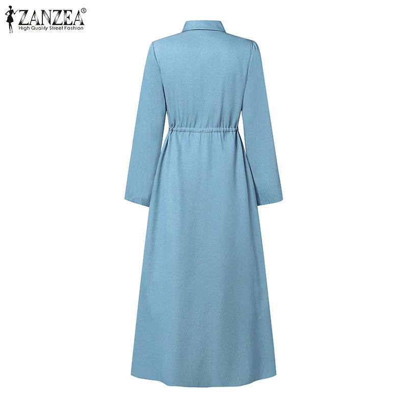 ZANZEA Donna Elegante Manica Lunga Lavoro Vestito Estivo 2025 Primavera Denim Blu Abito Casual Risvolto Collo Vacanza Abiti Maxi Robe Caftano